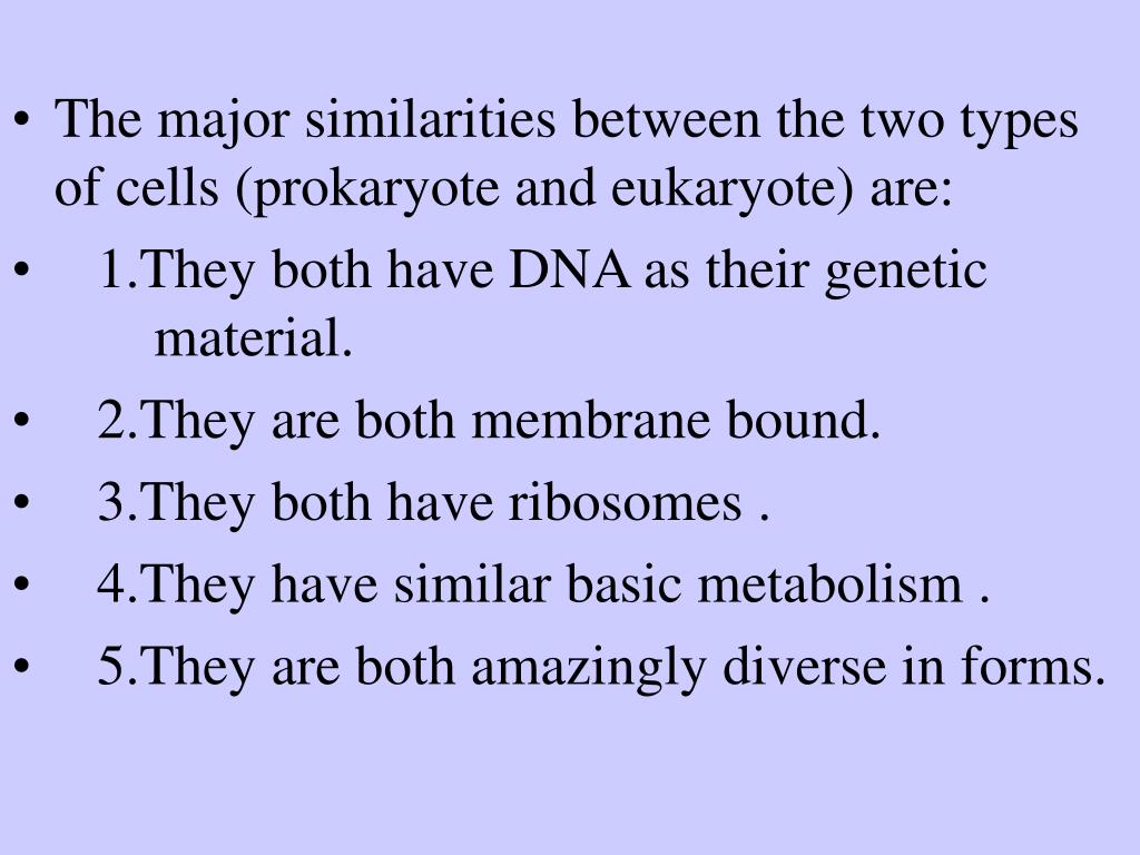 The major similarities between the two types of cells (prokaryote and eukaryote) are: • 1.They both have DNA as their genetic material. • 2.They are both membrane bound. • 3.They both have ribosomes . • 4.They have similar basic metabolism . • 5.They are both amazingly diverse in forms.