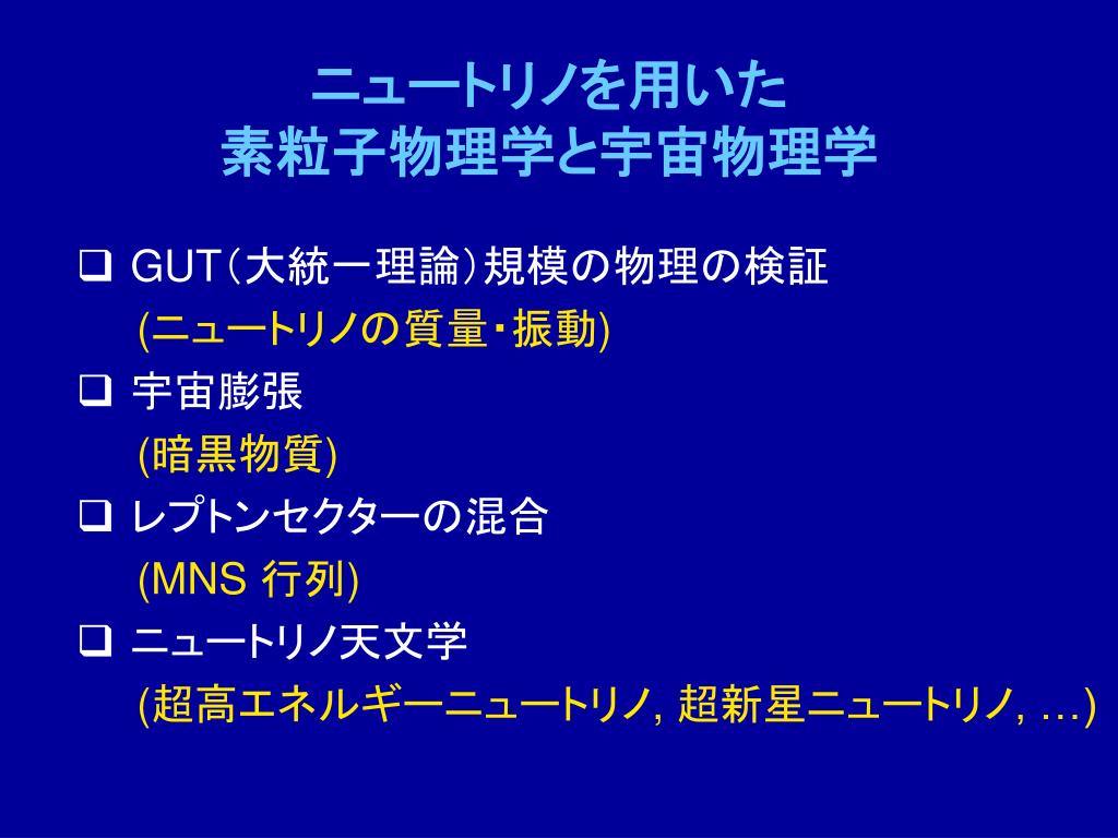 ニュートリノを用いた素粒子物理学と宇宙物理学ニュートリノを用いた素粒子物理学と宇宙物理学 • GUT(大統一理論)規模の物理の検証 (ニュートリノの質量・振動) • 宇宙膨張 (暗黒物質) • レプトンセクターの混合 (MNS 行列) • ニュートリノ天文学 (超高エネルギーニュートリノ, 超新星ニュートリノ, …)