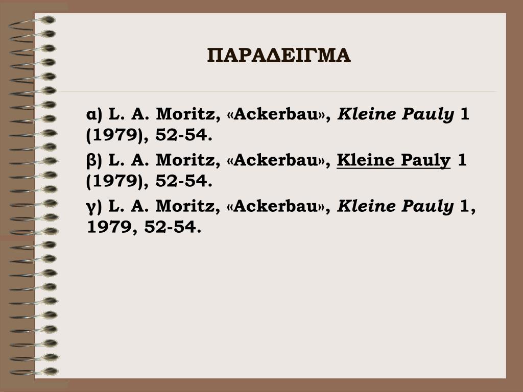 ΠΑΡΑΔΕΙΓΜΑ α) L. A. Moritz, «Ackerbau», Kleine Pauly 1 (1979), 52-54. β) L. A. Moritz, «Ackerbau», Kleine Pauly 1 (1979), 52-54. γ) L. A. Moritz, «Ackerbau», Kleine Pauly 1, 1979, 52-54.