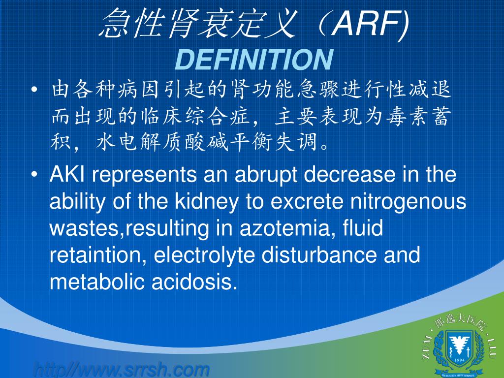 急性肾衰定义(ARF)DEFINITION • 由各种病因引起的肾功能急骤进行性减退而出现的临床综合症,主要表现为毒素蓄积,水电解质酸碱平衡失调。 • AKI represents an abrupt decrease in the ability of the kidney to excrete nitrogenous wastes,resulting in azotemia, fluid retaintion, electrolyte disturbance and metabolic acidosis.
