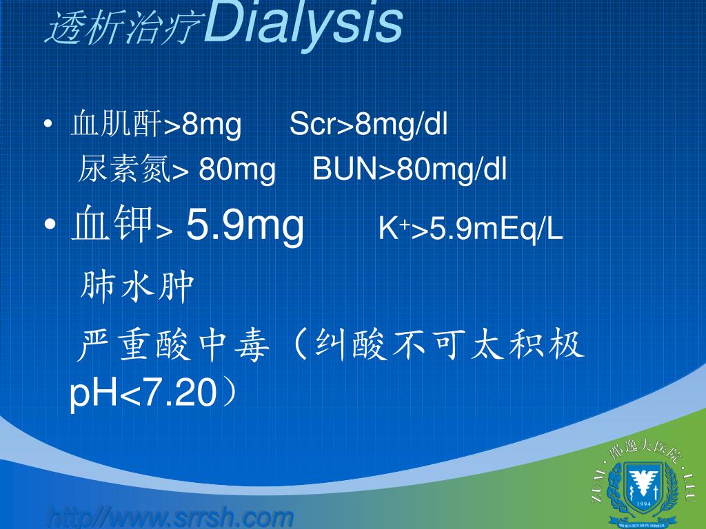 透析治疗Dialysis • 血肌酐>8mg Scr>8mg/dl 尿素氮> 80mg BUN>80mg/dl • 血钾> 5.9mg K+>5.9mEq/L 肺水肿 严重酸中毒(纠酸不可太积极pH<7.20)