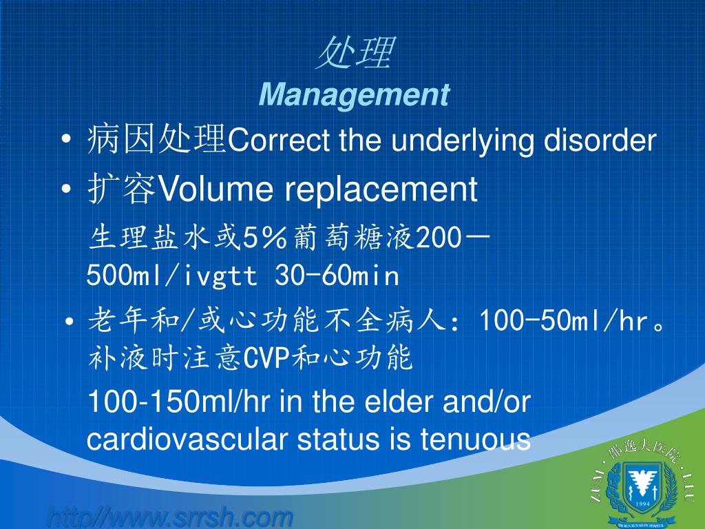 处理Management • 病因处理Correct the underlying disorder • 扩容Volume replacement • 生理盐水或5%葡萄糖液200-500ml/ivgtt 30-60min • 老年和/或心功能不全病人:100-50ml/hr。 补液时注意CVP和心功能 100-150ml/hr in the elder and/or cardiovascular status is tenuous