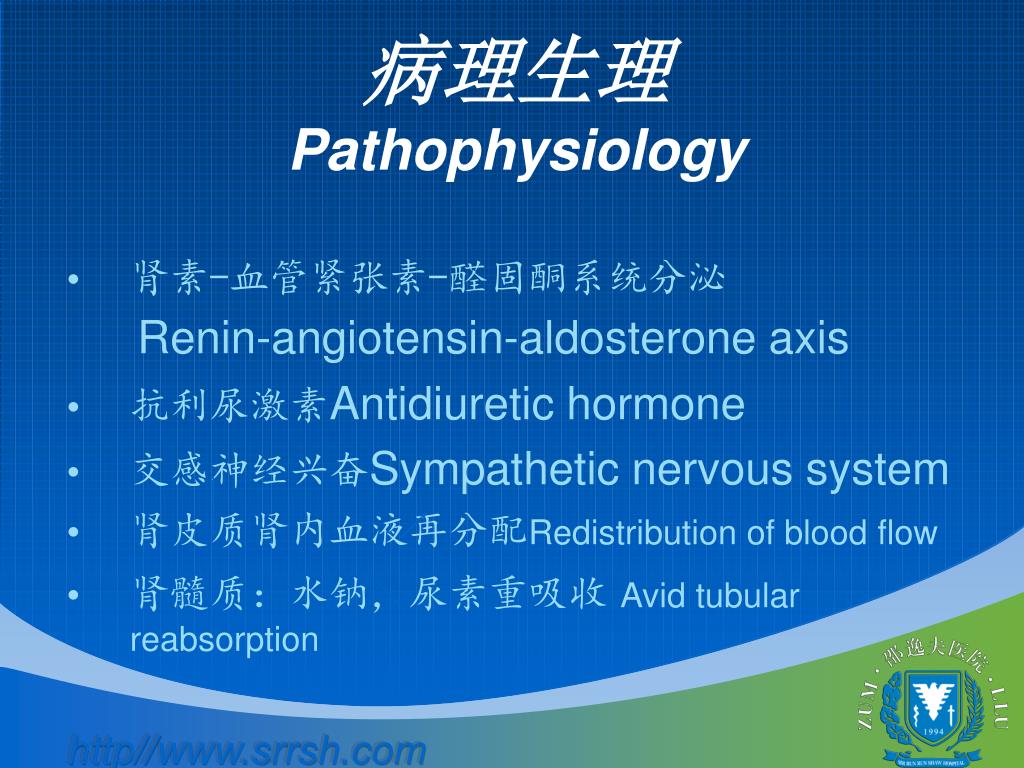 病理生理Pathophysiology • 肾素-血管紧张素-醛固酮系统分泌 Renin-angiotensin-aldosterone axis • 抗利尿激素Antidiuretic hormone • 交感神经兴奋Sympathetic nervous system • 肾皮质肾内血液再分配Redistribution of blood flow • 肾髓质:水钠,尿素重吸收Avid tubular reabsorption