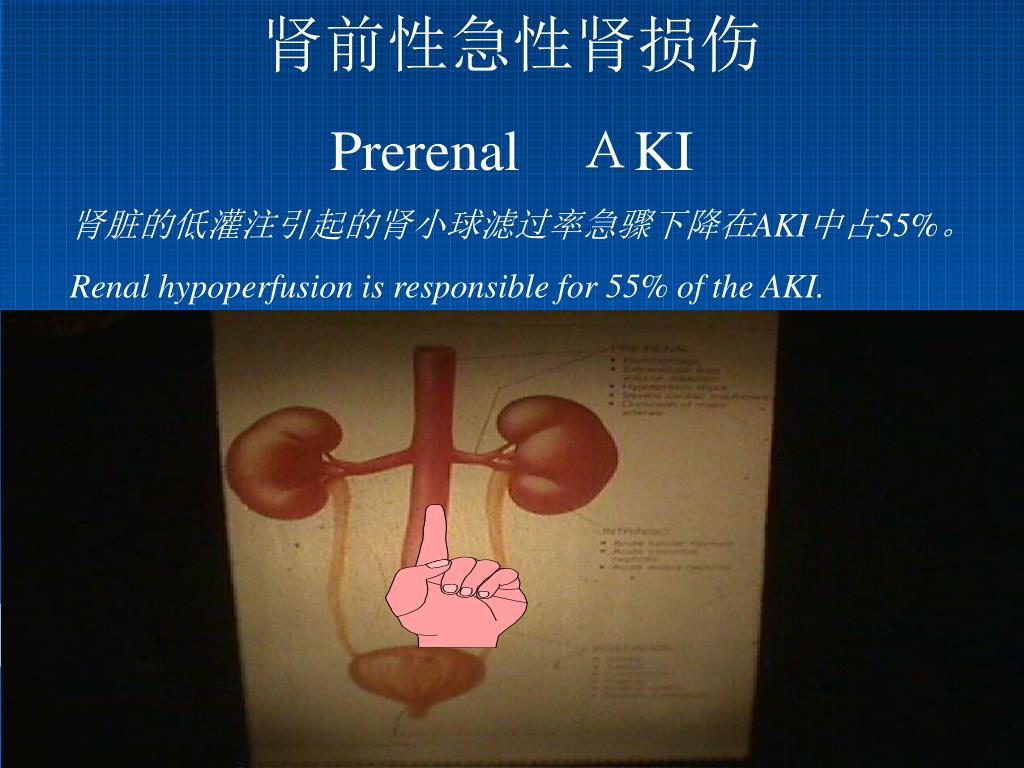 肾前性急性肾损伤 Prerenal AKI 肾脏的低灌注引起的肾小球滤过率急骤下降在AKI中占55%。 Renal hypoperfusion is responsible for 55% of the AKI.