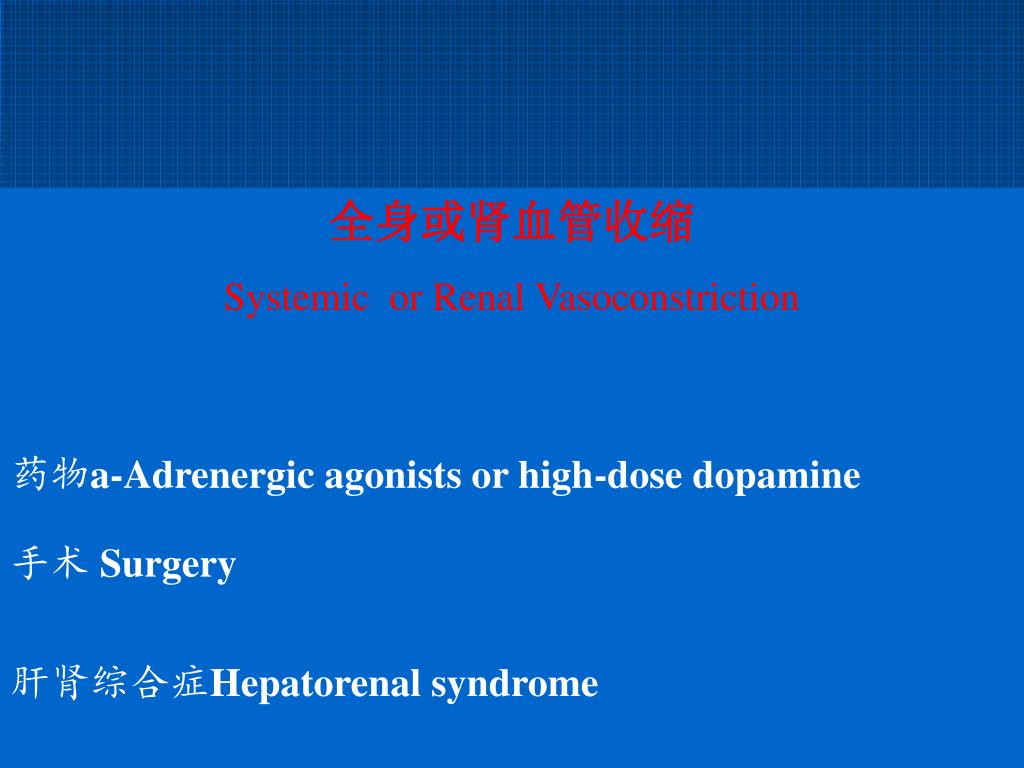 全身或肾血管收缩 Systemic or Renal Vasoconstriction 药物a-Adrenergic agonists or high-dose dopamine 手术Surgery 肝肾综合症Hepatorenal syndrome