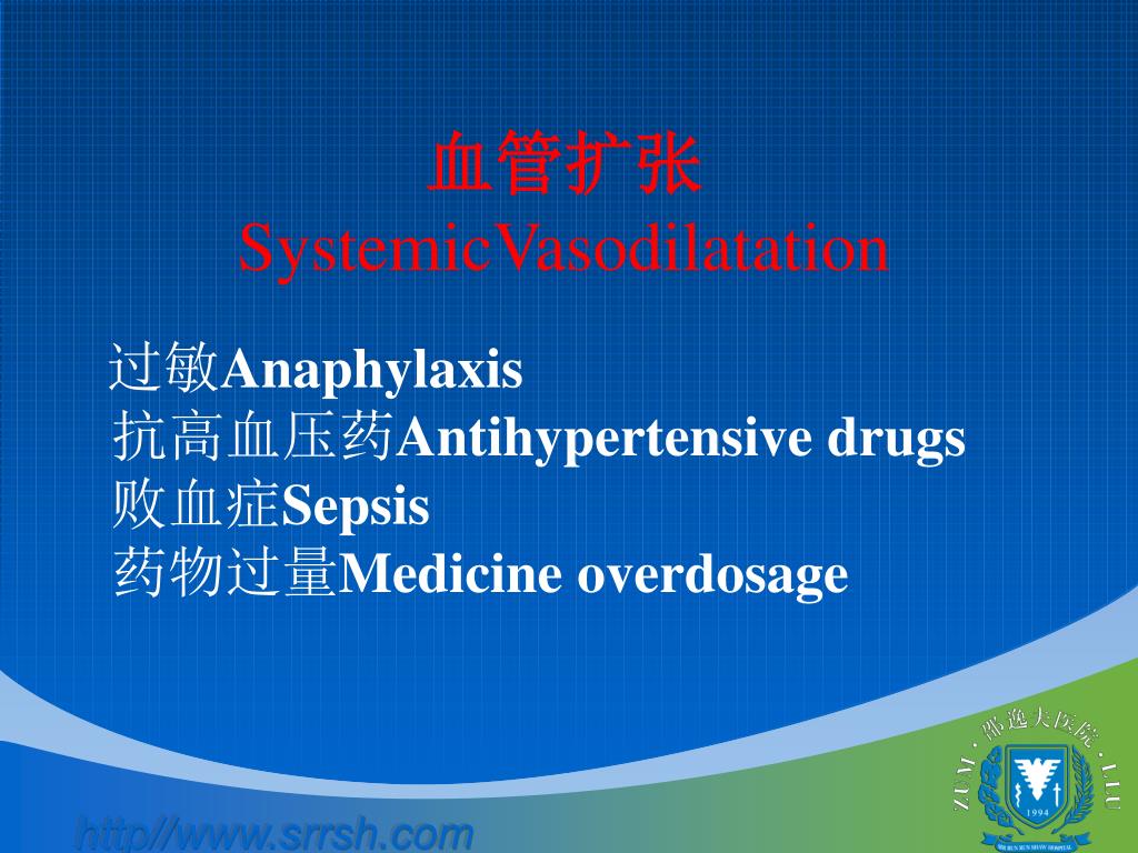 血管扩张 SystemicVasodilatation 过敏Anaphylaxis 抗高血压药Antihypertensive drugs 败血症Sepsis 药物过量Medicine overdosage