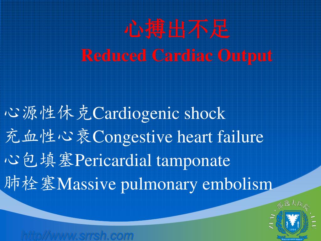 心搏出不足 Reduced Cardiac Output 心源性休克Cardiogenic shock 充血性心衰Congestive heart failure 心包填塞Pericardial tamponate 肺栓塞Massive pulmonary embolism