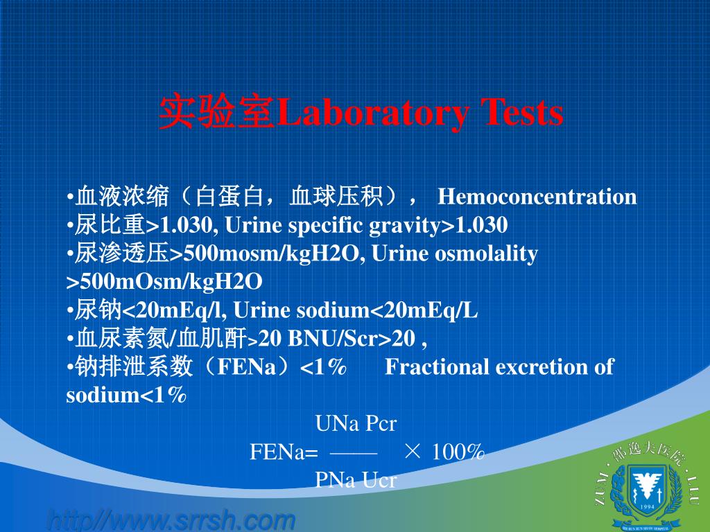 实验室Laboratory Tests • 血液浓缩(白蛋白,血球压积), Hemoconcentration • 尿比重>1.030, Urine specific gravity>1.030 • 尿渗透压>500mosm/kgH2O, Urine osmolality >500mOsm/kgH2O • 尿钠<20mEq/l, Urine sodium<20mEq/L • 血尿素氮/血肌酐>20 BNU/Scr>20 , • 钠排泄系数(FENa)<1% Fractional excretion of sodium<1% • UNa Pcr • FENa= —— × 100% • PNa Ucr
