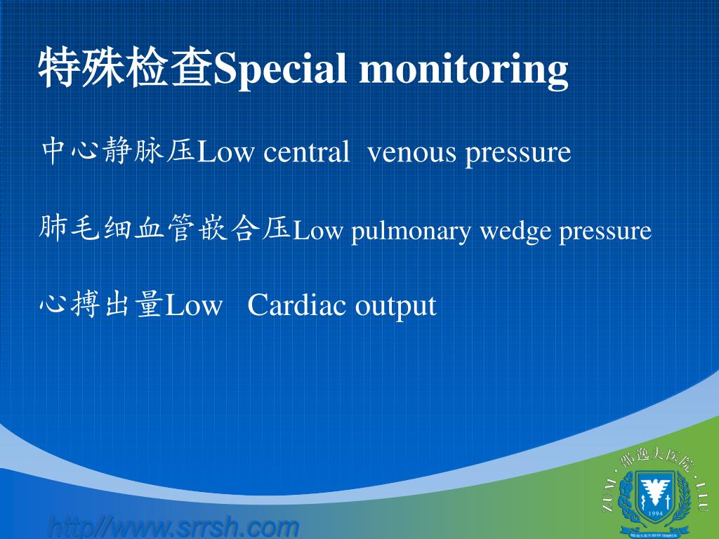 特殊检查Special monitoring 中心静脉压Low central venous pressure 肺毛细血管嵌合压Low pulmonary wedge pressure 心搏出量Low Cardiac output