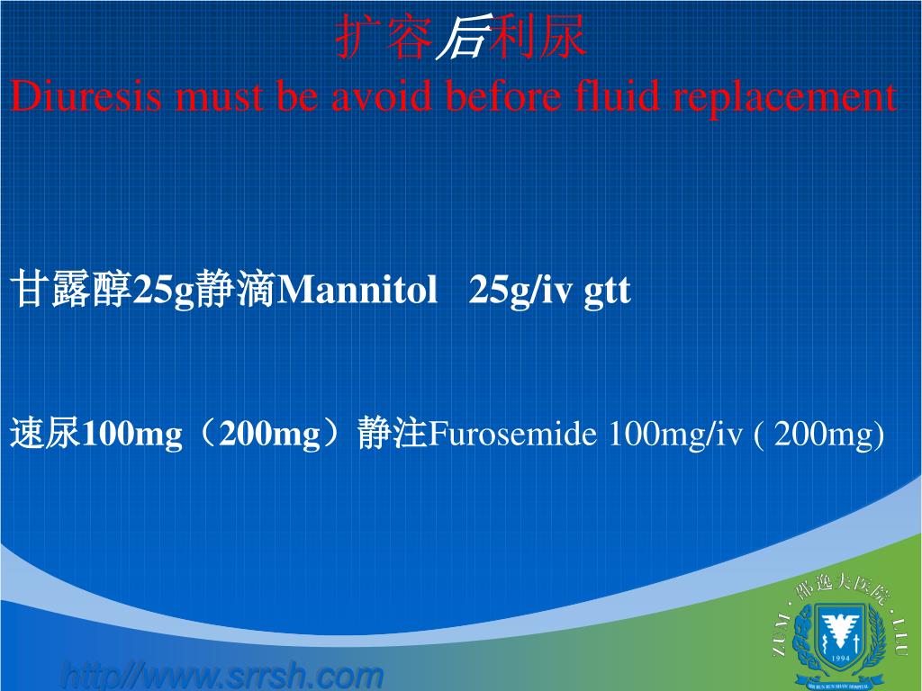 扩容后利尿 Diuresis must be avoid before fluid replacement 甘露醇25g静滴Mannitol 25g/iv gtt 速尿100mg(200mg)静注Furosemide 100mg/iv ( 200mg)
