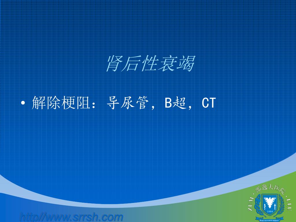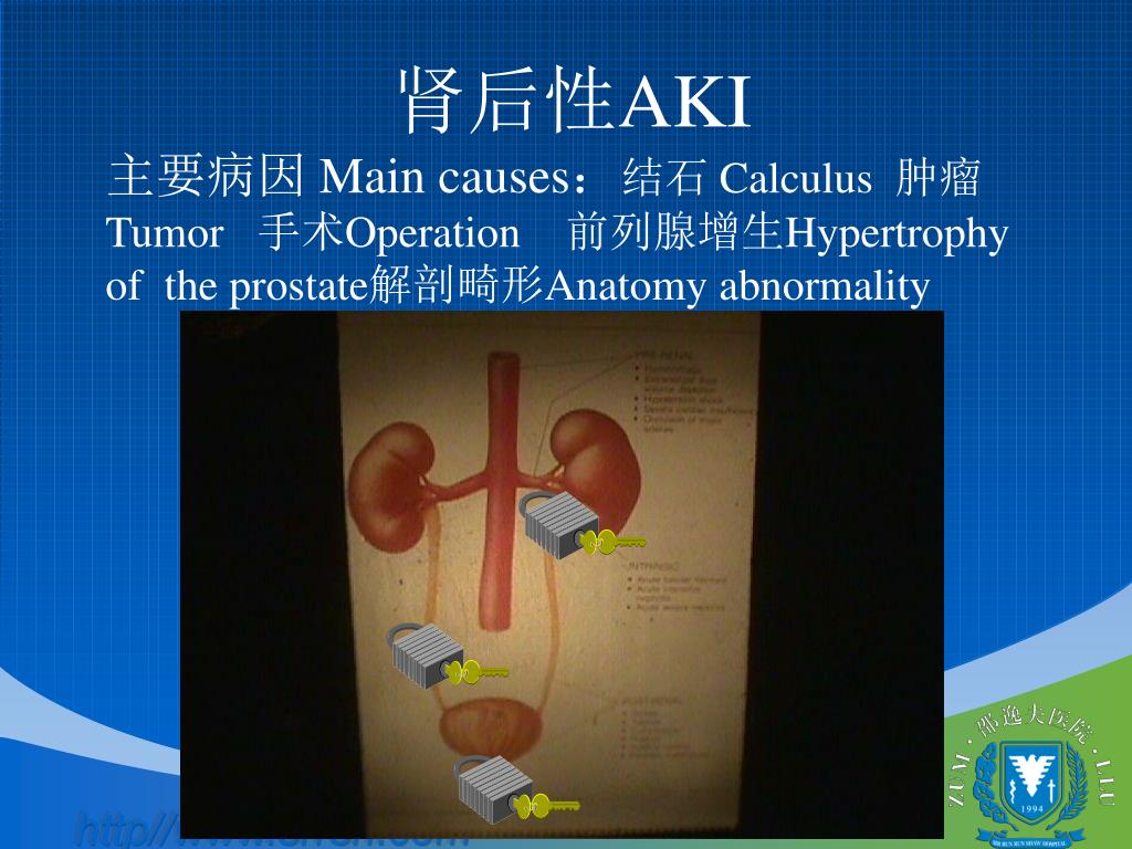 肾后性AKI 主要病因 Main causes:结石 Calculus 肿瘤Tumor 手术Operation 前列腺增生Hypertrophy of the prostate解剖畸形Anatomy abnormality