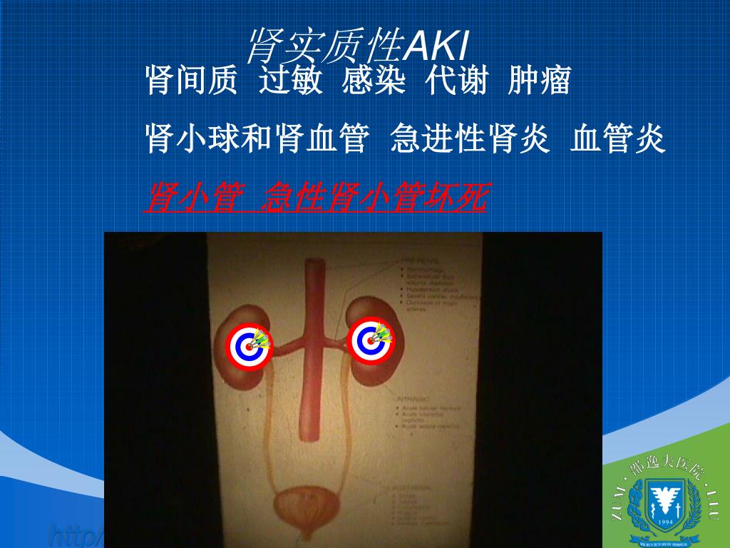 急性肾损伤 Acute Kidney Injury (AKI). 浙江大学邵逸夫医院肾脏科 叶有新. 浙江大学附属邵逸夫医院肾脏科 叶有新. 肾 脏 解 剖 Anatomy of the Kidney. 正常肾脏功能 Renal function. 排除毒素 Excretion of toxin 维持机体水、电解质和酸碱平衡 Maintaining water,electrolytes and acid-base balance 内分泌 Endocrine. 急性肾衰定义( ARF) DEFINITION.