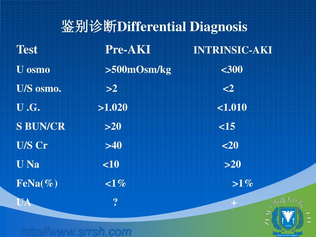 鉴别诊断Differential Diagnosis Test Pre-AKI INTRINSIC-AKI U osmo >500mOsm/kg <300 U/S osmo. >2 <2 U .G. >1.020 <1.010 S BUN/CR >20 <15 U/S Cr >40 <20 U Na <10 >20 FeNa(%) <1% >1% UA ? +