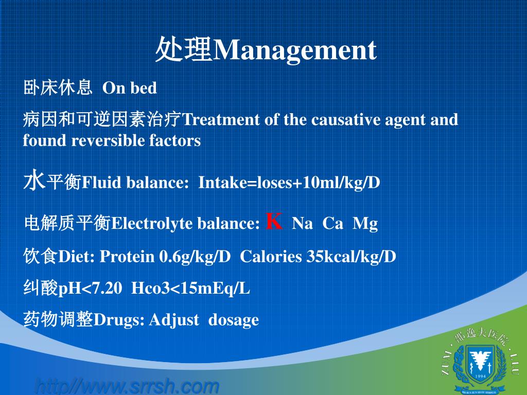 处理Management 卧床休息 On bed 病因和可逆因素治疗Treatment of the causative agent and found reversible factors 水平衡Fluid balance: Intake=loses+10ml/kg/D 电解质平衡Electrolyte balance: K Na Ca Mg 饮食Diet: Protein 0.6g/kg/D Calories 35kcal/kg/D 纠酸pH<7.20 Hco3<15mEq/L 药物调整Drugs: Adjust dosage