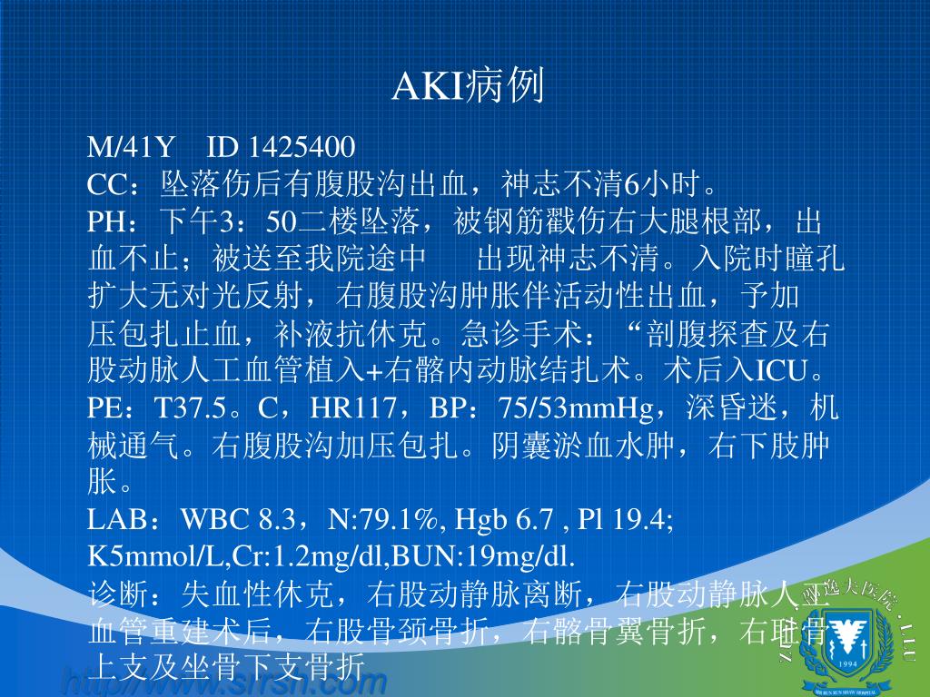AKI病例 M/41Y ID 1425400 CC:坠落伤后有腹股沟出血,神志不清6小时。 PH:下午3:50二楼坠落,被钢筋戳伤右大腿根部,出血不止;被送至我院途中 出现神志不清。入院时瞳孔扩大无对光反射,右腹股沟肿胀伴活动性出血,予加 压包扎止血,补液抗休克。急诊手术:“剖腹探查及右股动脉人工血管植入+右髂内动脉结扎术。术后入ICU。PE:T37.5。C,HR117,BP:75/53mmHg,深昏迷,机械通气。右腹股沟加压包扎。阴囊淤血水肿,右下肢肿胀。 LAB:WBC 8.3,N:79.1%, Hgb 6.7 , Pl 19.4; K5mmol/L,Cr:1.2mg/dl,BUN:19mg/dl. 诊断:失血性休克,右股动静脉离断,右股动静脉人工血管重建术后,右股骨颈骨折,右髂骨翼骨折,右耻骨上支及坐骨下支骨折