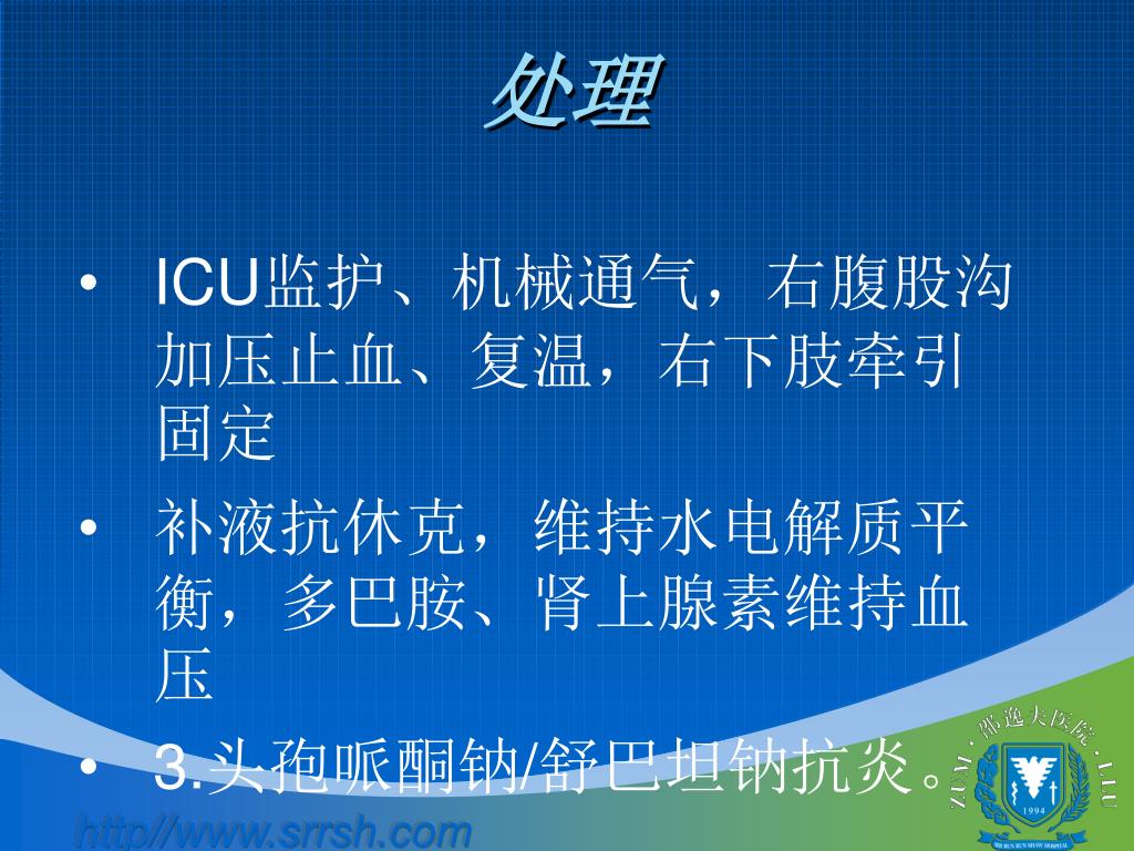 处理 • ICU监护、机械通气,右腹股沟加压止血、复温,右下肢牵引固定 • 补液抗休克,维持水电解质平衡,多巴胺、肾上腺素维持血压 • 3.头孢哌酮钠/舒巴坦钠抗炎。