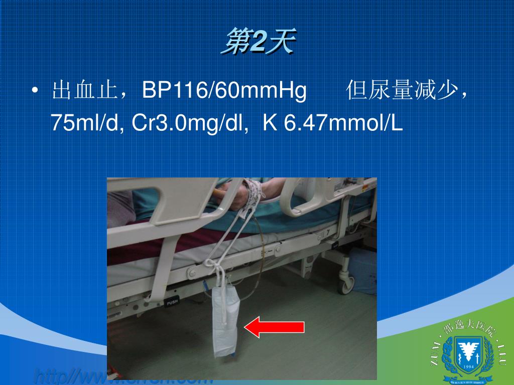 第2天 • 出血止,BP116/60mmHg 但尿量减少,75ml/d, Cr3.0mg/dl, K 6.47mmol/L