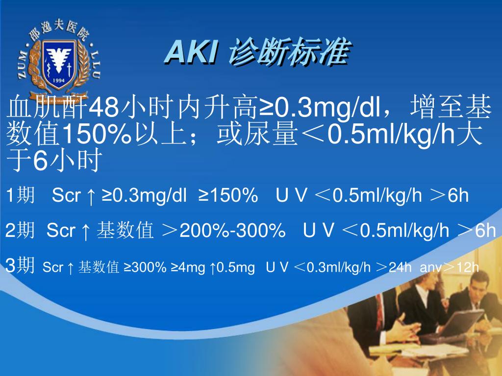 AKI 诊断标准 1期 Scr ↑ ≥0.3mg/dl ≥150% U V <0.5ml/kg/h >6h 2期 Scr ↑ 基数值 >200%-300% U V <0.5ml/kg/h >6h 3期Scr ↑ 基数值 ≥300% ≥4mg ↑0.5mgU V <0.3ml/kg/h >24h anv>12h 血肌酐48小时内升高≥0.3mg/dl,增至基数值150%以上;或尿量<0.5ml/kg/h大于6小时