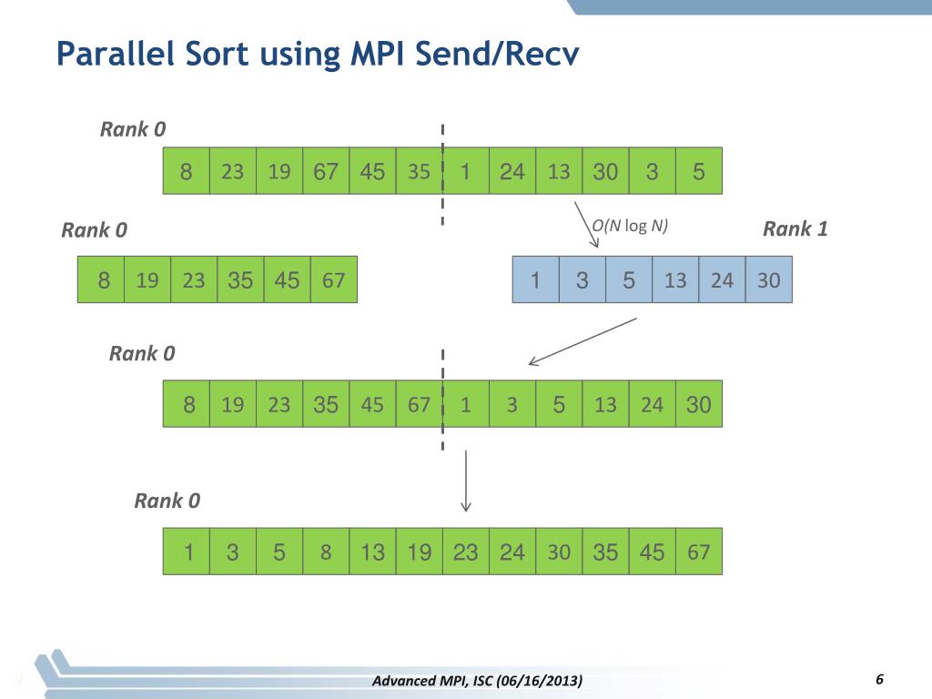Parallel Sort using MPI Send/Recv Rank 0 8 23 19 67 45 35 1 24 13 30 3 5 O(N log N) Rank 1 Rank 0 8 19 23 35 45 67 1 3 5 13 24 30 Rank 0 8 19 23 35 45 67 1 3 5 13 24 30 Rank 0 1 3 5 8 13 19 23 24 30 35 45 67 Advanced MPI, ISC (06/16/2013)