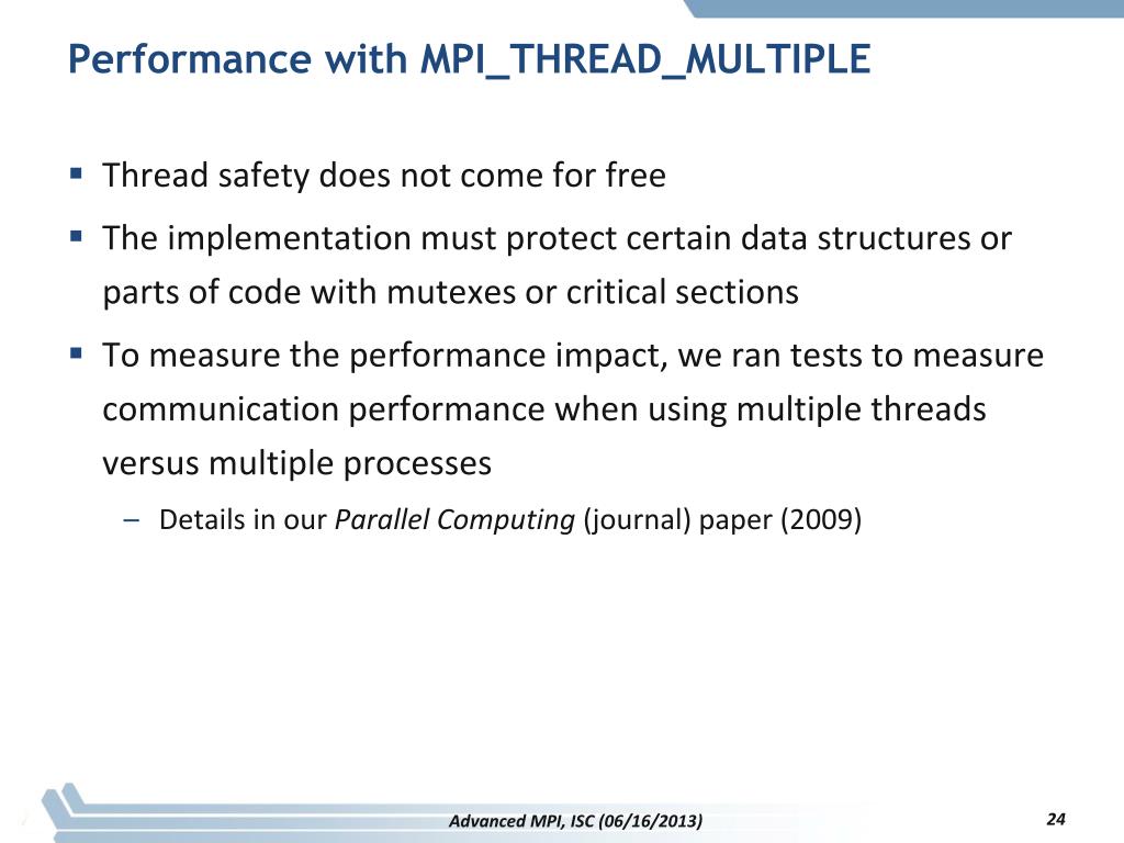 Performance with MPI_THREAD_MULTIPLE • Thread safety does not come for free • The implementation must protect certain data structures or parts of code with mutexes or critical sections • To measure the performance impact, we ran tests to measure communication performance when using multiple threads versus multiple processes • Details in our Parallel Computing (journal) paper (2009) Advanced MPI, ISC (06/16/2013)