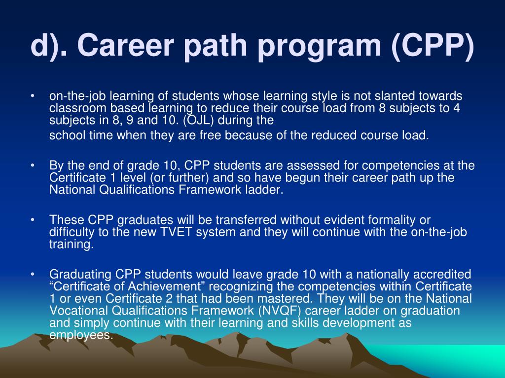 d). Career path program (CPP) • on‐the‐job learning of students whose learning style is not slanted towards classroom based learning to reduce their course load from 8 subjects to 4 subjects in 8, 9 and 10. (OJL) during the school time when they are free because of the reduced course load. • By the end of grade 10, CPP students are assessed for competencies at the Certificate 1 level (or further) and so have begun their career path up the National Qualifications Framework ladder. • These CPP graduates will be transferred without evident formality or difficulty to the new TVET system and they will continue with the on‐the‐job training. • Graduating CPP students would leave grade 10 with a nationally accredited “Certificate of Achievement” recognizing the competencies within Certificate 1 or even Certificate 2 that had been mastered. They will be on the National Vocational Qualifications Framework (NVQF) career ladder on graduation and simply continue with their learning and skills development as employees.