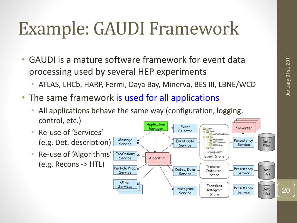 Example: GAUDI Framework • GAUDI is a mature software framework for event data processing used by several HEP experiments • ATLAS, LHCb, HARP, Fermi, Daya Bay, Minerva, BES III, LBNE/WCD • The same framework is used for all applications • All applications behave the same way (configuration, logging, control, etc.) • Re-use of ‘Services’(e.g. Det. description) • Re-use of ‘Algorithms’ (e.g. Recons -> HTL)