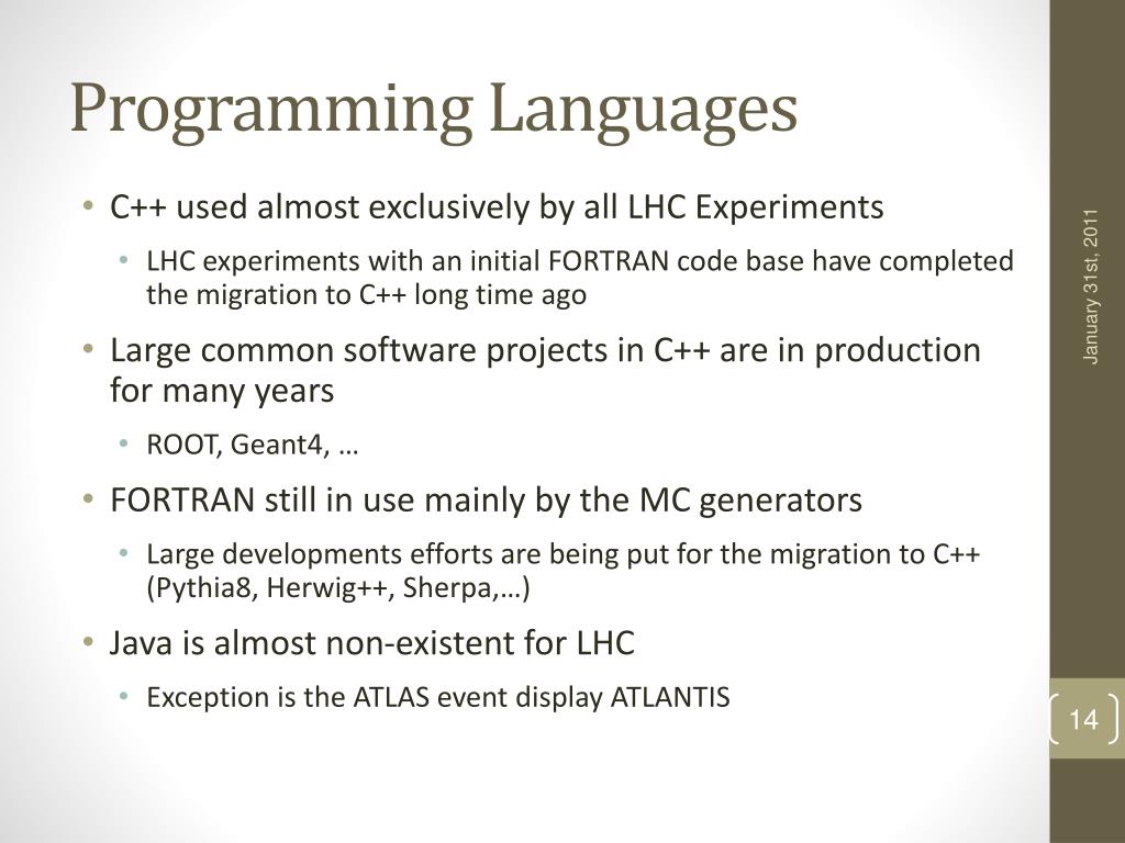 Programming Languages • C++ used almost exclusively by all LHC Experiments • LHC experiments with an initial FORTRAN code base have completed the migration to C++ long time ago • Large common software projects in C++ are in production for many years • ROOT, Geant4, … • FORTRAN still in use mainly by the MC generators • Large developments efforts are being put for the migration to C++ (Pythia8, Herwig++, Sherpa,…) • Java is almost non-existent for LHC • Exception is the ATLAS event display ATLANTIS