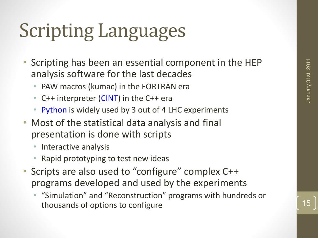Scripting Languages • Scripting has been an essential component in the HEP analysis software for the last decades • PAW macros (kumac) in the FORTRAN era • C++ interpreter (CINT) in the C++ era • Pythonis widely used by 3 out of 4 LHC experiments • Most of the statistical data analysis and final presentation is done with scripts • Interactive analysis • Rapid prototyping to test new ideas • Scripts are also used to “configure” complex C++ programs developed and used by the experiments • “Simulation” and “Reconstruction” programs with hundreds or thousands of options to configure