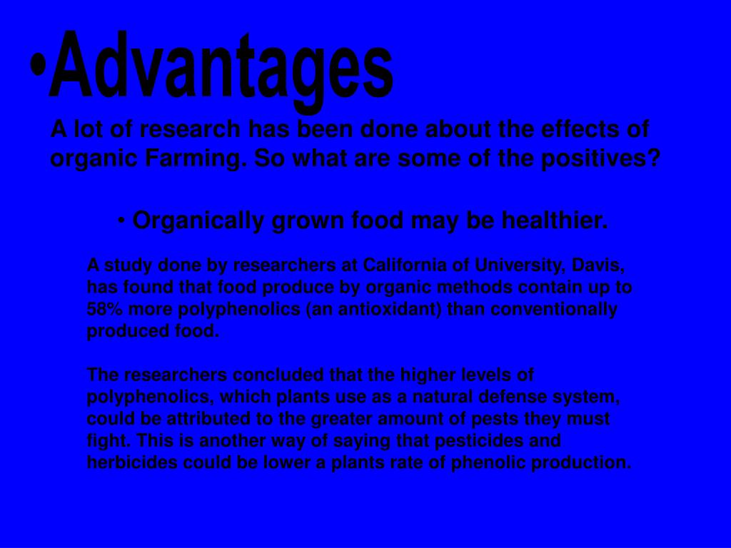 Advantages A lot of research has been done about the effects of organic Farming. So what are some of the positives? Organically grown food may be healthier. A study done by researchers at California of University, Davis, has found that food produce by organic methods contain up to 58% more polyphenolics (an antioxidant) than conventionally produced food. The researchers concluded that the higher levels of polyphenolics, which plants use as a natural defense system, could be attributed to the greater amount of pests they must fight. This is another way of saying that pesticides and herbicides could be lower a plants rate of phenolic production.