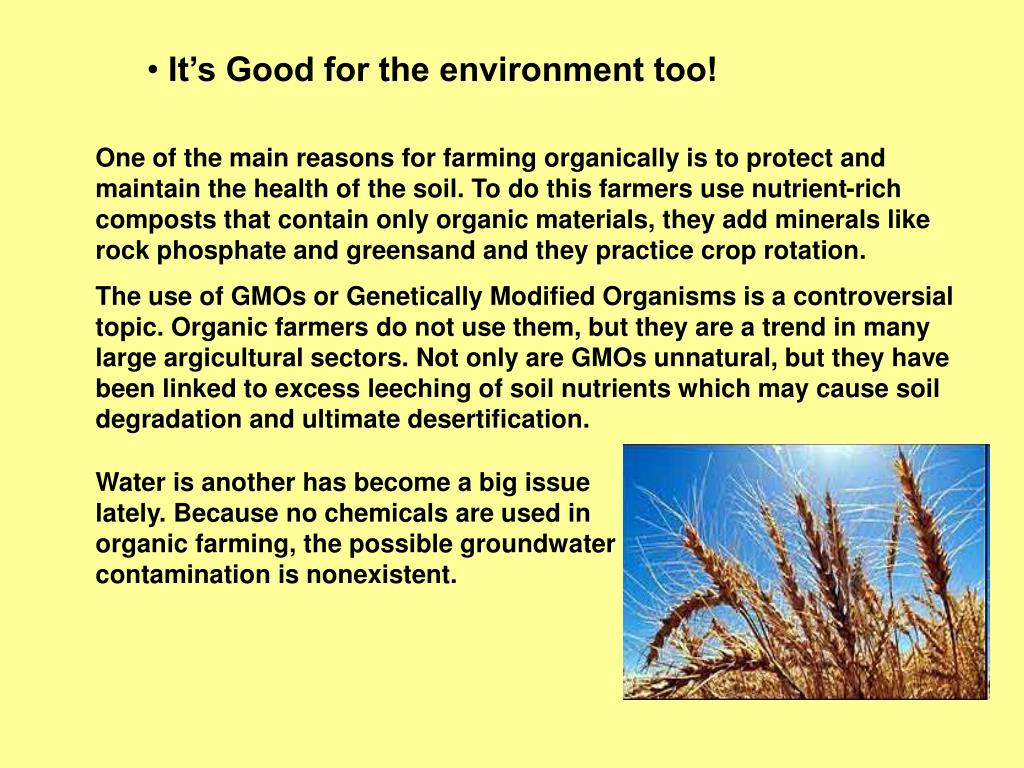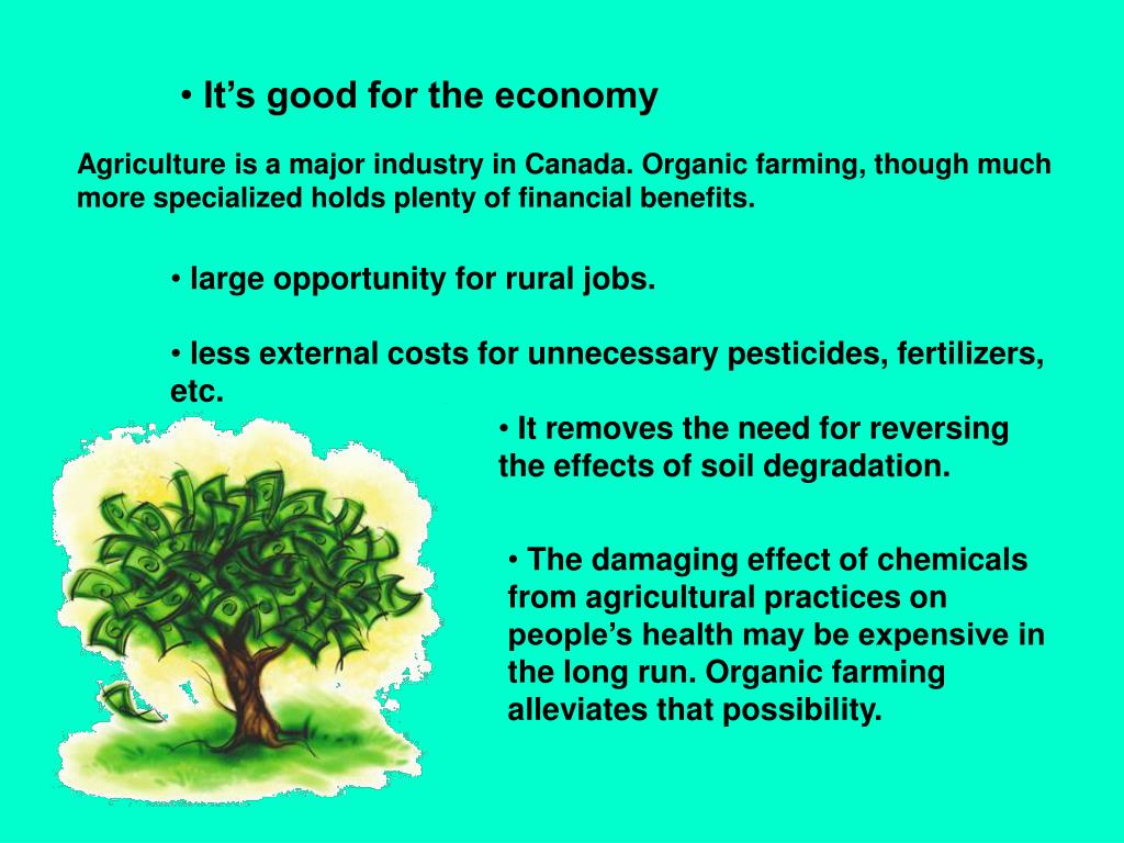 It’s good for the economy Agriculture is a major industry in Canada. Organic farming, though much more specialized holds plenty of financial benefits. large opportunity for rural jobs. less external costs for unnecessary pesticides, fertilizers, etc. It removes the need for reversing the effects of soil degradation. The damaging effect of chemicals from agricultural practices on people’s health may be expensive in the long run. Organic farming alleviates that possibility.