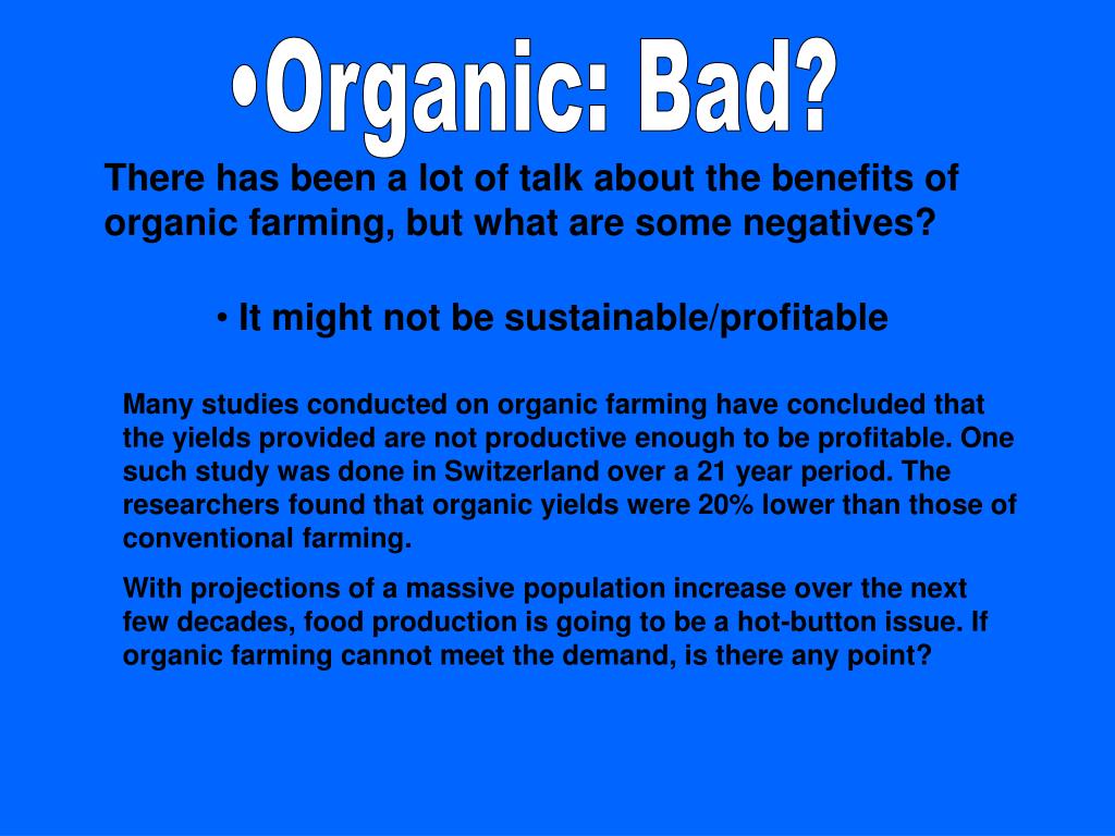 Organic: Bad? There has been a lot of talk about the benefits of organic farming, but what are some negatives? It might not be sustainable/profitable Many studies conducted on organic farming have concluded that the yields provided are not productive enough to be profitable. One such study was done in Switzerland over a 21 year period. The researchers found that organic yields were 20% lower than those of conventional farming. With projections of a massive population increase over the next few decades, food production is going to be a hot-button issue. If organic farming cannot meet the demand, is there any point?