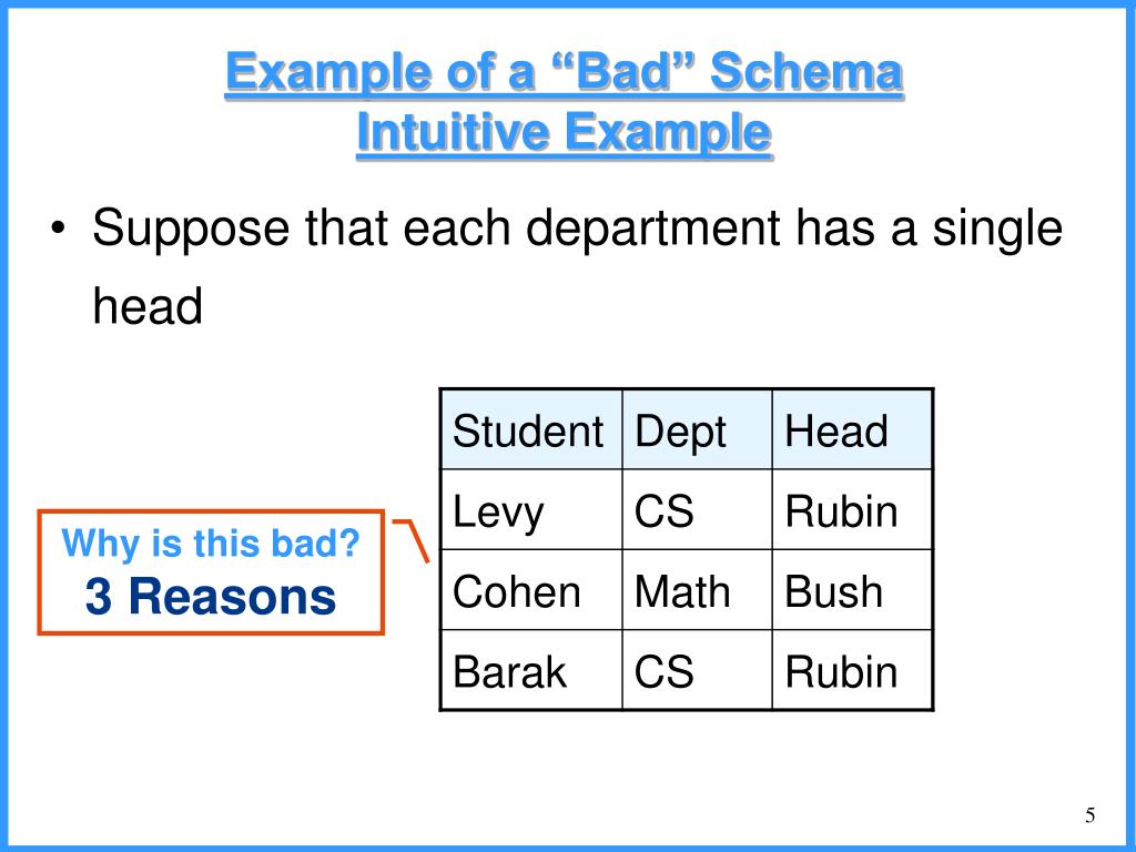 Example of a “Bad” SchemaIntuitive Example • Suppose that each department has a single head Why is this bad? 3 Reasons