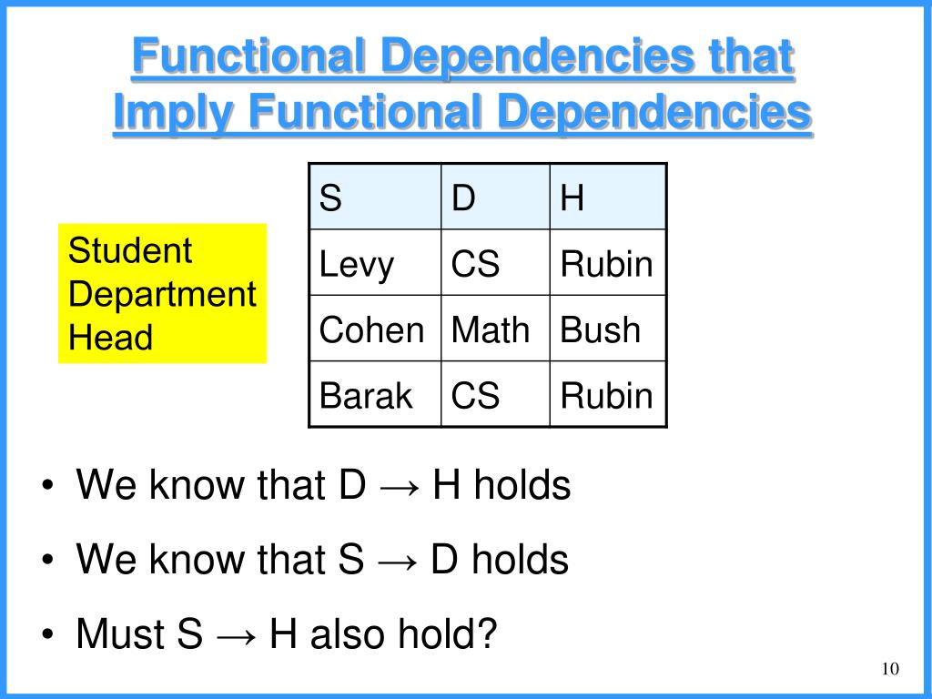 Functional Dependencies that Imply Functional Dependencies • We know that D → H holds • We know that S → Dholds • Must S → H also hold? Student Department Head