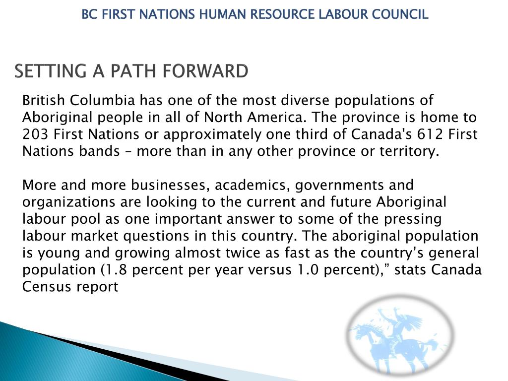 SETTING A PATH FORWARD BC FIRST NATIONS HUMAN RESOURCE LABOUR COUNCIL British Columbia has one of the most diverse populations of Aboriginal people in all of North America. The province is home to 203 First Nations or approximately one third of Canada's 612 First Nations bands – more than in any other province or territory. More and more businesses, academics, governments and organizations are looking to the current and future Aboriginal labour pool as one important answer to some of the pressing labour market questions in this country. The aboriginal population is young and growing almost twice as fast as the country’s general population (1.8 percent per year versus 1.0 percent),” stats Canada Census report