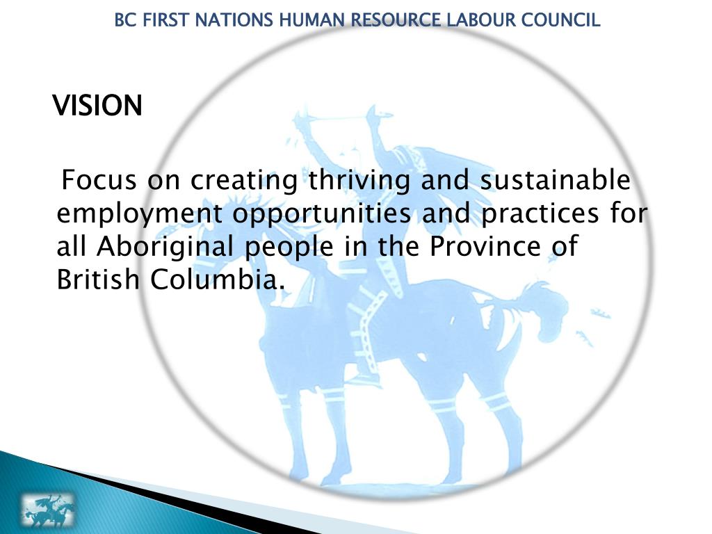BC FIRST NATIONS HUMAN RESOURCE LABOUR COUNCIL VISION Focus on creating thriving and sustainable employment opportunities and practices for all Aboriginal people in the Province of British Columbia.