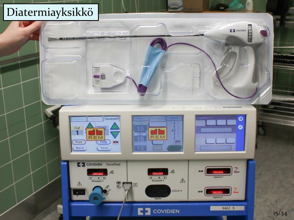 Lähteet KIRURGINEN DIATERMIALAITE - DI Jukka Honkanen http://en.wikipedia.org/wiki/Diathermy http://www.kauppalehti.fi/sponsoroidutblogit/laser-tilkka/laserkirurgia-mita-missa-milloin http://personal.fimnet.fi/laaketiede/hanski.tapiovaara/parannusta_ja_helpotusta.htm http://www.duodecimlehti.fi/ http://www.terveyskirjasto.fi/ http://www.hus.fi/sairaanhoito/sairaanhoitopalvelut/kirurgia http://www.ebm-guidelines.com/dtk/syd/avaa?p_artikkeli=syk00049 http://www.trumpf-med.com/ http://www.articlesbase.com/medicine-articles/use-of-pneumatics-in-medical-devices-4904123.html http://www.kojair.com/fi/tuotteet/sairaalatuotteet/leikkaussali-ilmastointi http://ssty.fi/download/Luennot/KaleviKayhko.pdf http://www.ecophon.com/fi/Ratkaisut/Tilatyypit/Terveydenhuollon-tilat/Leikkaussali/