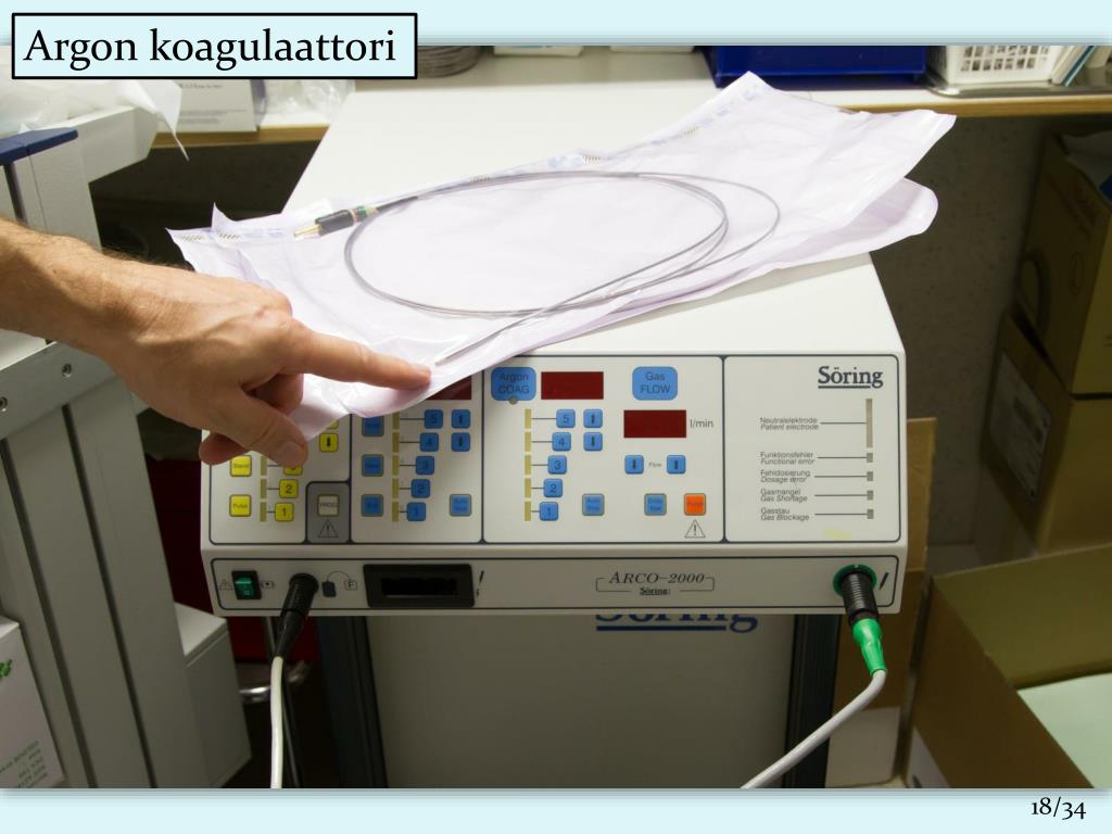 Kirurginen Diatermia • Aktiivi- ja passiivielektrodi • Suurtaajuus • Polttopiste pysyy pienenä • Suurjännite • 1-2 kV, 500 kHz • Monopolaari- ja bipolaaritekniikka • Suojakaasudiatermia • Argon