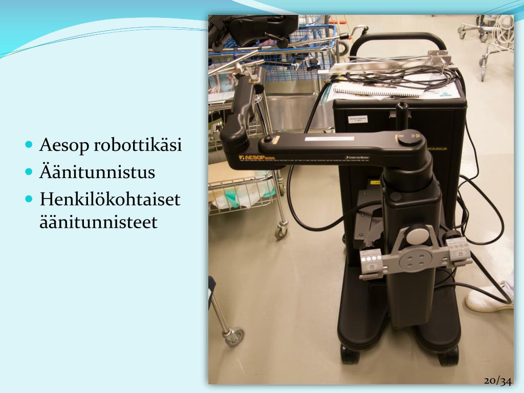 Automaatio ja robotiikka • Yksinkertaisimmillaan apukäsi • Davinci leikkausrobotti • Ohjauskonsoli • 3D kuva • Robotiikan etuja: • Tarkkuus • Nopeampi potilaan toipuminen • Etäkäyttö • Robotiikan haittoja: • Hinta