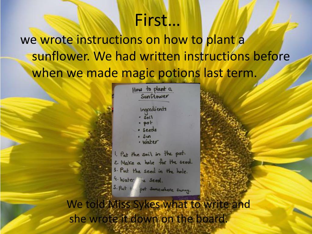 Planting Sunflowers. By Year 1. First…. w e wrote instructions on how to plant a sunflower. We had written instructions before when we made magic potions last term. We told Miss Sykes what to write and she wrote it down on the board. Then….