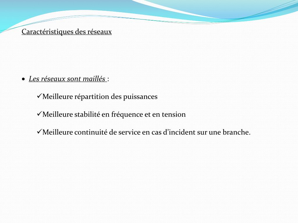 Caractéristiques des réseaux • Les réseaux sont maillés : • Meilleure répartition des puissances • Meilleure stabilité en fréquence et en tension • Meilleure continuité de service en cas d’incident sur une branche.