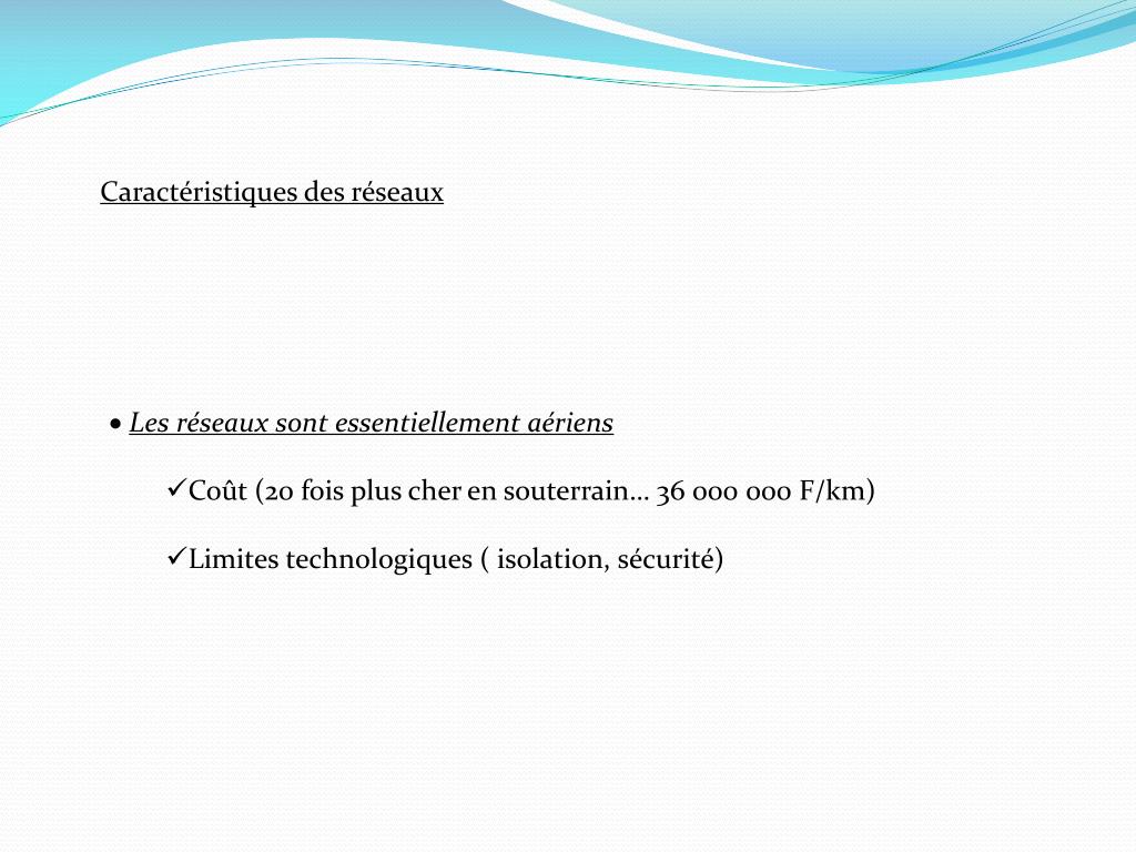 Caractéristiques des réseaux • Les réseaux sont essentiellement aériens • Coût (20 fois plus cher en souterrain… 36 000 000 F/km) • Limites technologiques ( isolation, sécurité)