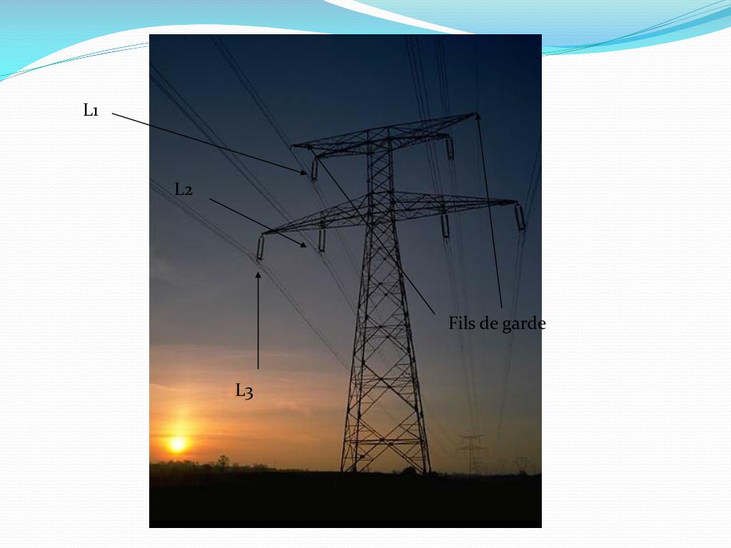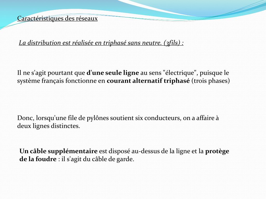 Caractéristiques des réseaux La distribution est réalisée en triphasé sans neutre. (3fils) : Il ne s'agit pourtant que d'une seule ligne au sens "électrique", puisque le système français fonctionne en courant alternatif triphasé (trois phases) Donc, lorsqu'une file de pylônes soutient six conducteurs, on a affaire à deux lignes distinctes. Un câble supplémentaire est disposé au-dessus de la ligne et la protège de la foudre : il s'agit du câble de garde.