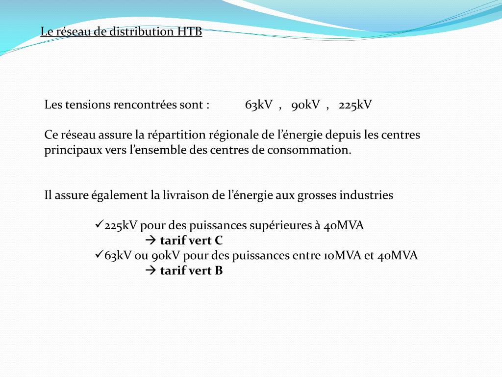 Le réseau de distribution HTB • Les tensions rencontrées sont : 63kV , 90kV , 225kV • Ce réseau assure la répartition régionale de l’énergie depuis les centres principaux vers l’ensemble des centres de consommation. • Il assure également la livraison de l’énergie aux grosses industries • 225kV pour des puissances supérieures à 40MVA tarif vert C • 63kV ou 90kV pour des puissances entre 10MVA et 40MVA tarif vert B