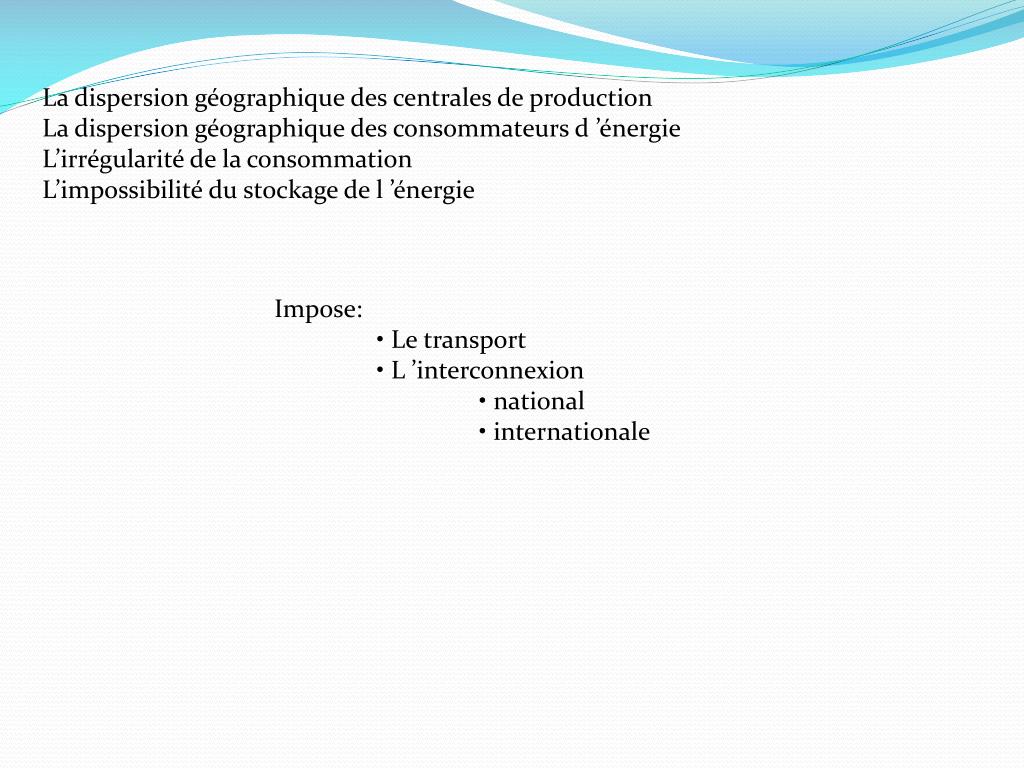 La dispersion géographique des centrales de production La dispersion géographique des consommateurs d ’énergie L’irrégularité de la consommation L’impossibilité du stockage de l ’énergie • Impose: • Le transport • L ’interconnexion • national • internationale