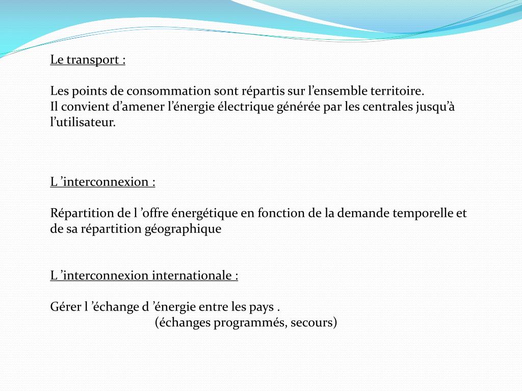 Le transport : Les points de consommation sont répartis sur l’ensemble territoire. Il convient d’amener l’énergie électrique générée par les centrales jusqu’à l’utilisateur. L ’interconnexion : Répartition de l ’offre énergétique en fonction de la demande temporelle et de sa répartition géographique L ’interconnexion internationale : Gérer l ’échange d ’énergie entre les pays . (échanges programmés, secours)