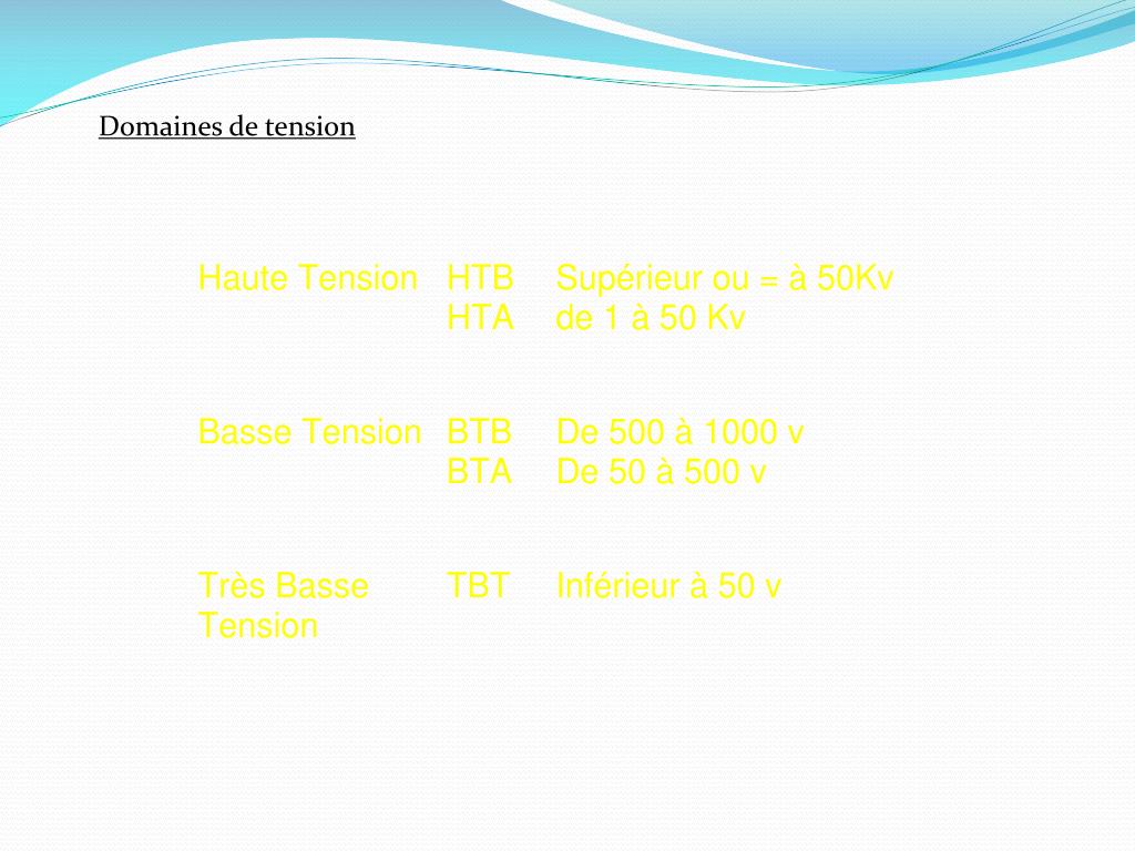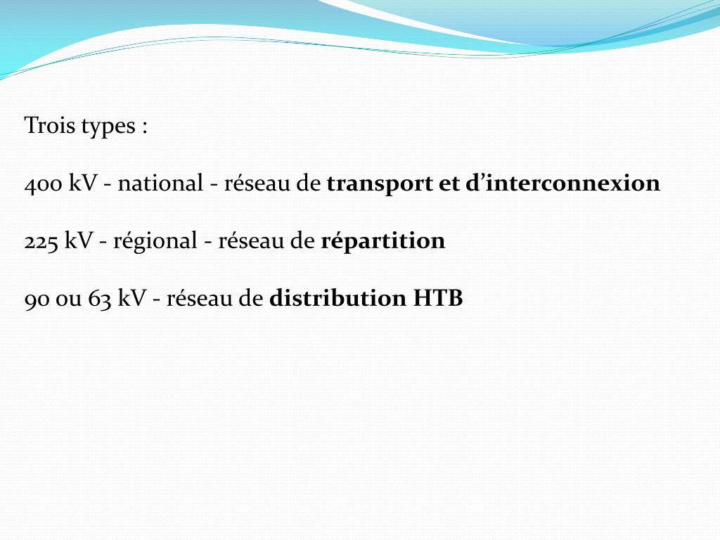 Trois types : 400 kV - national - réseau de transport et d’interconnexion 225 kV - régional - réseau de répartition 90 ou 63 kV - réseau de distribution HTB