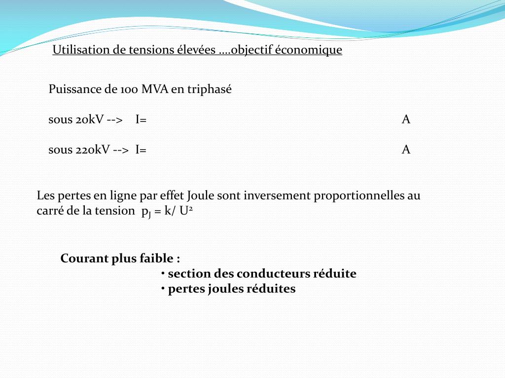 Utilisation de tensions élevées ….objectif économique Puissance de 100 MVA en triphasé sous 20kV --> I= A sous 220kV -->I= A Les pertes en ligne par effet Joule sont inversement proportionnelles au carré de la tension pJ = k/ U2 • Courant plus faible : • section des conducteurs réduite • pertes joules réduites