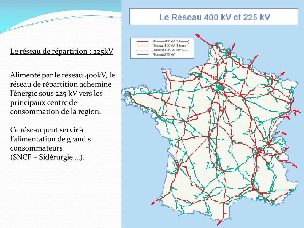 Le réseau de répartition : 225kV Alimenté par le réseau 400kV, le réseau de répartition achemine l’énergie sous 225 kV vers les principaux centre de consommation de la région. Ce réseau peut servir à l’alimentation de grand s consommateurs (SNCF – Sidérurgie …).