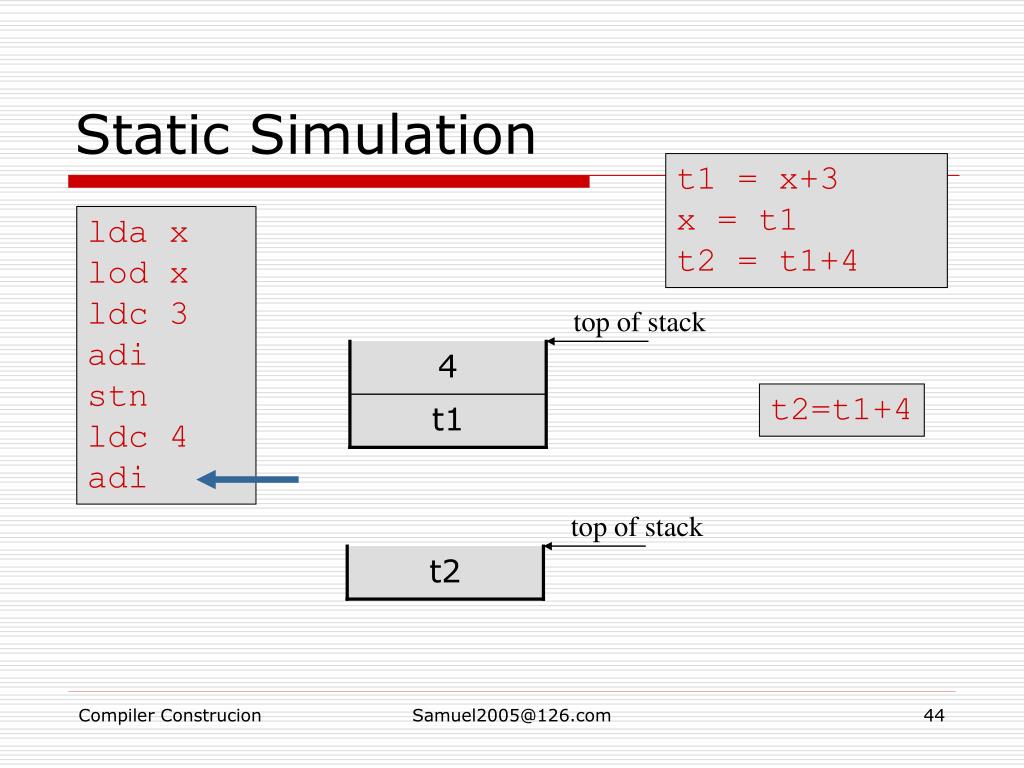 Static Simulation lda x lod x ldc 3 adi stn ldc 4 adi top of stack t1 address of x x=t1 top of stack t1 Samuel2005@126.com