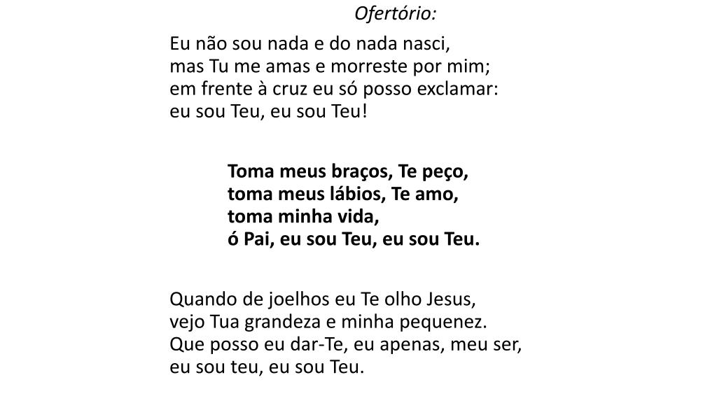 Ofertório: Eu não sou nada e do nada nasci,mas Tu me amas e morreste por mim;em frente à cruz eu só posso exclamar:eu sou Teu, eu sou Teu! Toma meus braços, Te peço,toma meus lábios, Te amo,toma minha vida,ó Pai, eu sou Teu, eu sou Teu. Quando de joelhos eu Te olho Jesus,vejo Tua grandeza e minha pequenez.Que posso eu dar-Te, eu apenas, meu ser,eu sou teu, eu sou Teu.